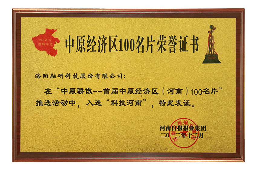 中原經(jīng)濟(jì)區(qū)100名片證書
